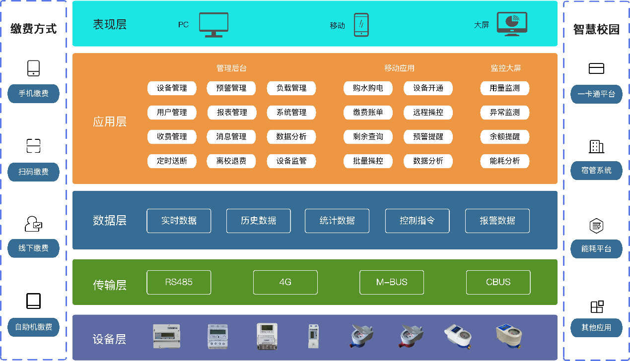 新開普物聯(lián)網(wǎng)智能水電解決方案覆蓋高校宿舍、商戶等多類用水用電場(chǎng)景,實(shí)現(xiàn)多場(chǎng)景下的水電能源統(tǒng)一管理。系統(tǒng)集水電計(jì)量、收費(fèi)管理、用能監(jiān)控于一體,具備精準(zhǔn)計(jì)量、便捷收費(fèi)與集中管控能力。針對(duì)校園管理痛點(diǎn),提供惡性負(fù)載識(shí)別預(yù)警、定時(shí)與節(jié)假日通斷電、水電聯(lián)動(dòng)控制、自助繳費(fèi)查詢等智能化功能,全面提升水電能源管理效率,助力高校構(gòu)建一體化水電管控綜合服務(wù)體系。