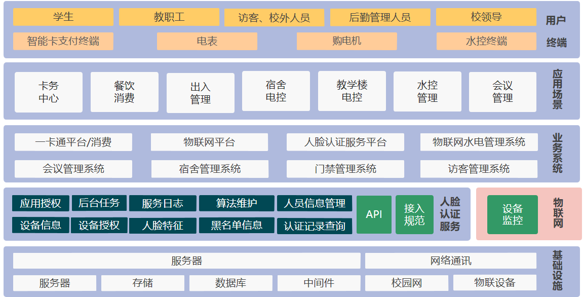 中等職業(yè)教育一卡通校園建設(shè),主要對教學(xué)、人事、財務(wù)、后勤、宿舍、考勤、通道、門禁以及校內(nèi)消費等進(jìn)行管理,充分節(jié)約管理資源,實現(xiàn)信息數(shù)據(jù)的集成與共享,通過共同的身份認(rèn)證機制,使校園智能化建設(shè)的各部分有機的融合為一個整體, 避免各個部門各自為戰(zhàn)、獨立結(jié)算,造成一人多卡,給教工、學(xué)生帶來極大不便,從而導(dǎo)致工作效率低下,資源浪費嚴(yán)重等問題。同時根據(jù)客戶需求采用本地和SAAS兩種部署模式,解決辦學(xué)規(guī)模建設(shè)資金、人員管理等方面的限制。隨著校園卡的建成、二維碼的成熟、人臉識別的應(yīng)用,多種核身應(yīng)用技術(shù)的逐漸智能化,伴隨著銀校合作力度的逐步加大,為校園一卡通的發(fā)展創(chuàng)造了成熟條件;避免重復(fù)投入,提高信息化建設(shè)效率,更有效地融合信息資源。